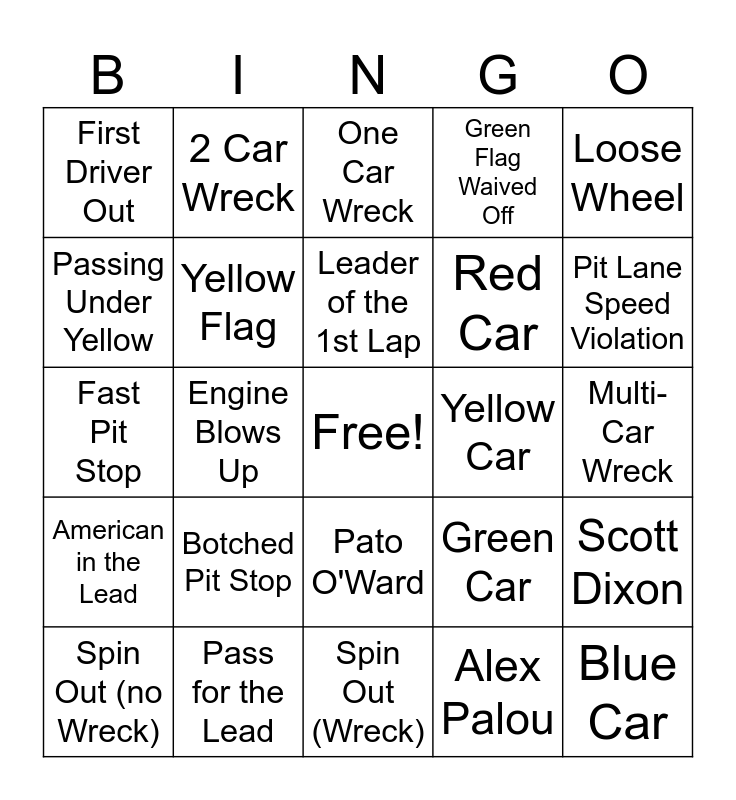 This bingo card has a free space and 24 words: Botched Pit Stop, Pass for the Lead, Leader of the 1st Lap, Spin Out (no Wreck), Loose Wheel, First Driver Out, Passing Under Yellow, 2 Car Wreck, Yellow Car, Pato O'Ward, Red Car, Fast Pit Stop, Green Car, Scott Dixon, Yellow Flag, Alex Palou, Multi-Car Wreck, One Car Wreck, Pit Lane Speed Violation, Engine Blows Up, Blue Car, American in the Lead, Green Flag Waived Off and Spin Out (Wreck).