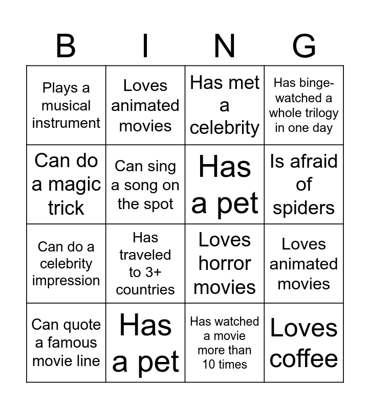 ⚠ This card has duplicate items: Has met a celebrity (2), Can speak 4 or more languages (2), Has a pet (2), Plays a musical instrument (2), Has traveled to 3+ countries (2), Is afraid of spiders (2), Has tried skydiving or bungee jumping (2), Can do a magic trick (2), Loves binge-watching TV series (2), Loves animated movies (2), Has binge-watched a whole trilogy in one day (2), Can quote a famous movie line (2), Has watched a movie more than 10 times (2), Can sing a song on the spot (2), Loves coffee (2), Loves horror movies (2)