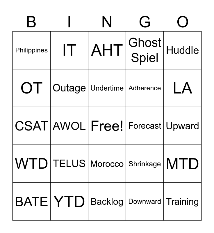 This bingo card has a free space and 75 words: SLA, ASA, AHT, ACW, HOLD TIME, TALK TIME, Occupancy, Interval, KPI, Billable, Absenteeism, Tardy, Undertime, OT, VTO, AWOL, Productive, Training, Coaching, Huddle, QA, CSAT, Outage, IT, Ghost Spiel, Downtime, RCA, RACI, Trend, Capacity, Non Billable, OOO, In Office, Shrinkage, LA, Adherence, Utilization, Graph, Upward, Downward, Client, RTA, Scheduler, Business Partner, Planner, COE, BATE, Philippines, India, South Africa, China, Morocco, Guatemala, Bulgaria, Romania, Ireland, Canada, CRM, Verint, Capability, TELUS, Transactions, Staffing, Book to bill, Average, Forecast, 30-60-90, MBR, QBR, MTD, WTD, YTD, Queue, Backlog and TPH.