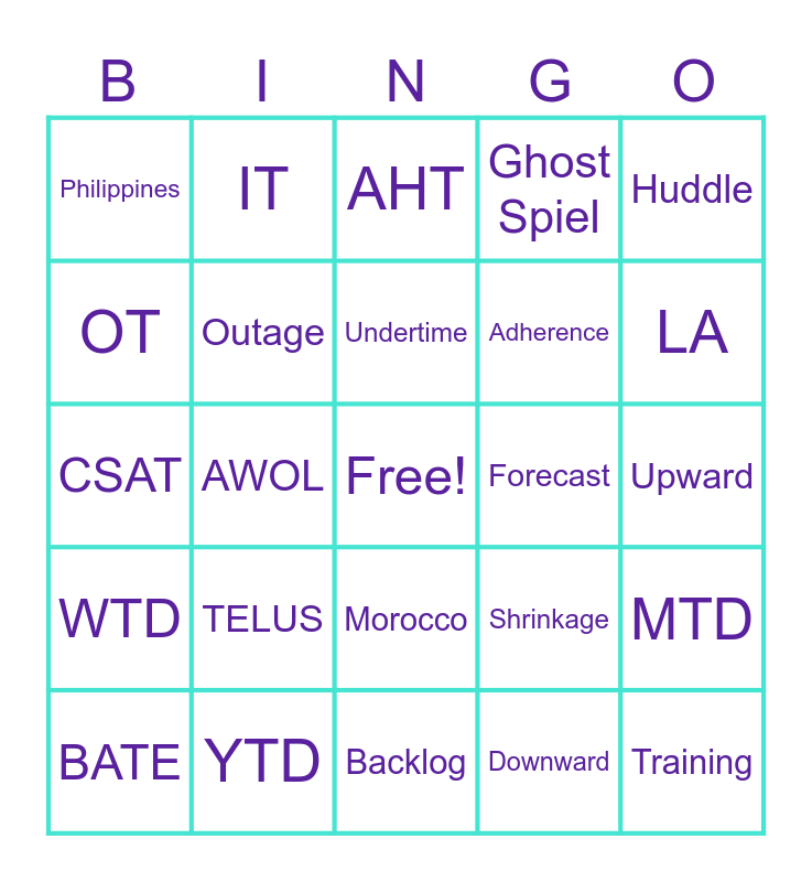 This bingo card has a free space and 75 words: SLA, ASA, AHT, ACW, HOLD TIME, TALK TIME, Occupancy, Interval, KPI, Billable, Absenteeism, Tardy, Undertime, OT, VTO, AWOL, Productive, Training, Coaching, Huddle, QA, CSAT, Outage, IT, Ghost Spiel, Downtime, RCA, RACI, Trend, Capacity, Non Billable, OOO, In Office, Shrinkage, LA, Adherence, Utilization, Graph, Upward, Downward, Client, RTA, Scheduler, Business Partner, Planner, COE, BATE, Philippines, India, South Africa, China, Morocco, Guatemala, Bulgaria, Romania, Ireland, Canada, CRM, Verint, Capability, TELUS, Transactions, Staffing, Book to bill, Average, Forecast, 30-60-90, MBR, QBR, MTD, WTD, YTD, Queue, Backlog and TPH.