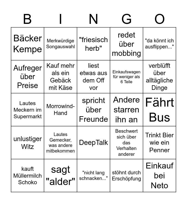 This bingo card has 25 words: Lautes Gemecker, was andere mitbekommen, "nicht lang schnacken...", liest etwas aus dem Off vor, kauft Müllermilch Schoko, "da könnt ich ausflippen...", Bäcker Kempe, Aufreger über Preise, Merkwürdige Songauswahl, Andere starren ihn an, DeepTalk, Einkaufswagen für weniger als 6 Teile, Lautes Meckern im Supermarkt, Beschwert sich über das Verhalten anderer, Trinkt Bier wie ein Penner, Kauf mehr als ein Gebäck mit Käse, Einkauf bei Neto, Fährt Bus, "friesisch herb", verblüfft über alltägliche Dinge, Morrowind-Hand, spricht über Freunde, sagt "alder", unlustiger Witz, redet über mobbing and stöhnt durch Erschöpfung.