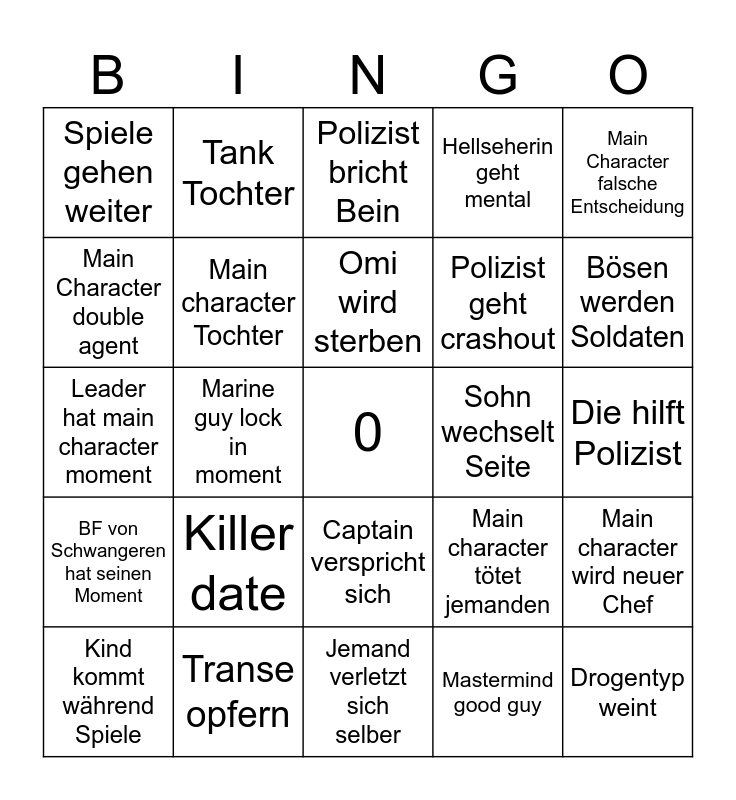 This bingo card has a free space and 24 words: Killer date, Transe opfern, Omi wird sterben, Kind kommt während Spiele, Main Character falsche Entscheidung, Spiele gehen weiter, Main Character double agent, Tank Tochter, Sohn wechselt Seite, Captain verspricht sich, Polizist geht crashout, Leader hat main character moment, Main character tötet jemanden, Main character wird neuer Chef, Main character Tochter, Mastermind good guy, Die hilft Polizist, Polizist bricht Bein, Bösen werden Soldaten, Marine guy lock in moment, Drogentyp weint, BF von Schwangeren hat seinen Moment, Hellseherin geht mental and Jemand verletzt sich selber.