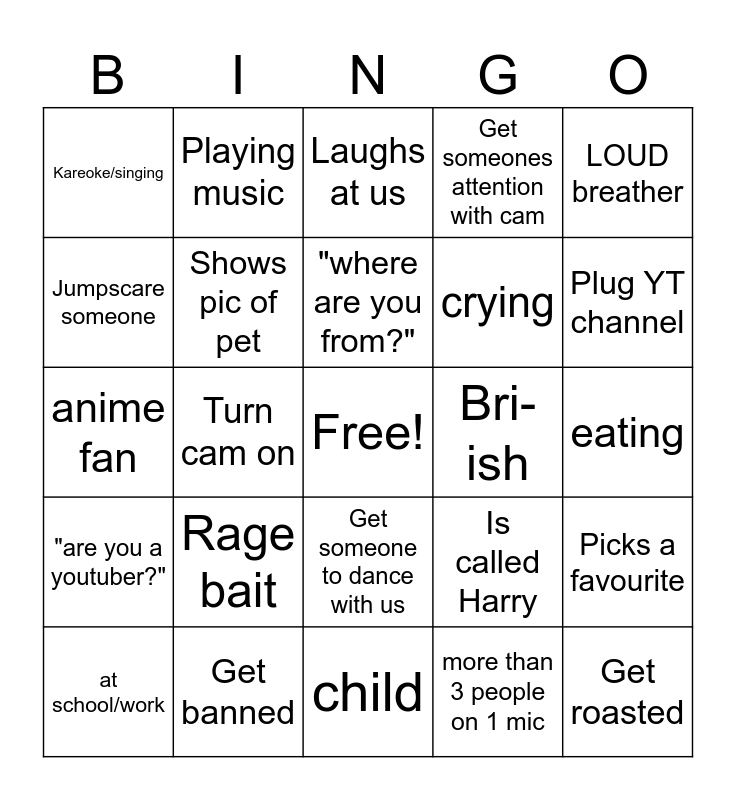 This bingo card has a free space and 24 words: Rage bait, Get banned, "where are you from?", at school/work, LOUD breather, Kareoke/singing, Jumpscare someone, Playing music, Bri-ish, Get someone to dance with us, crying, anime fan, Is called Harry, Picks a favourite, Shows pic of pet, more than 3 people on 1 mic, eating, Laughs at us, Plug YT channel, Turn cam on, Get roasted, "are you a youtuber?", Get someones attention with cam and child.