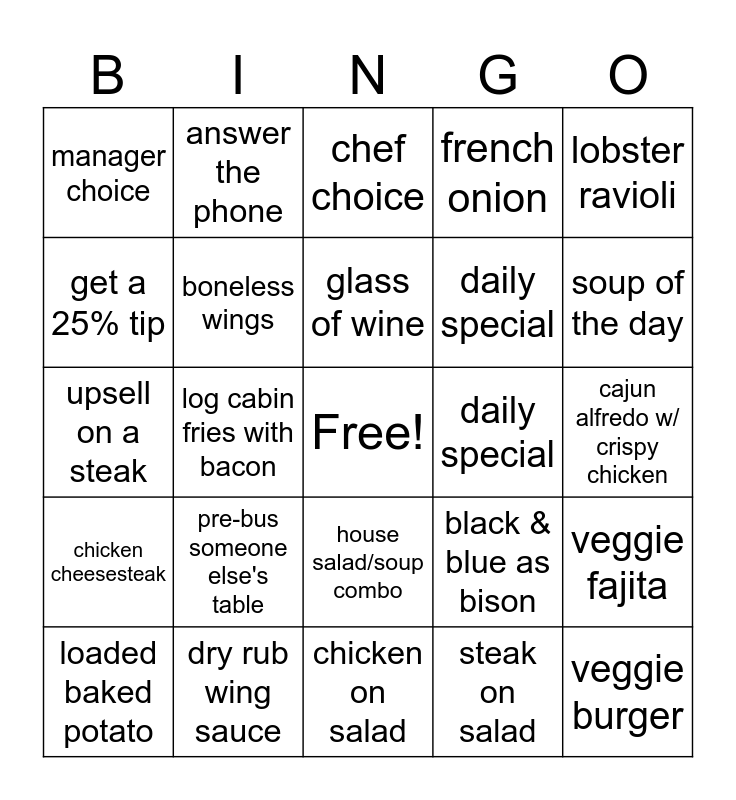 This bingo card has a free space and 29 words: loaded baked potato, dessert, log cabin fries with bacon, refill beer cooler, manager choice, chef choice, boneless wings, pre-bus someone else's table, daily special, dry rub wing sauce, cajun alfredo w/ crispy chicken, veggie burger, chicken on salad, steak on salad, soup of the day, elk burger, house salad/soup combo, chicken cheesesteak, lobster ravioli, upsell on a steak, black & blue as bison, elk burger, daily special, get a 25% tip, french onion, answer the phone, veggie fajita, glass of wine and dessert.