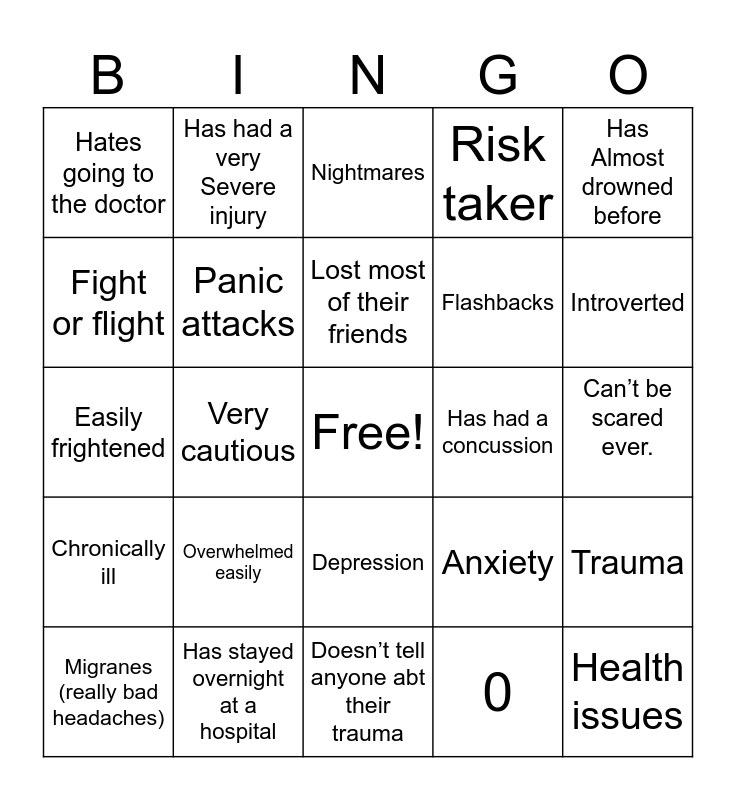 This bingo card has a free space and 25 words: Overwhelmed easily, Doesn’t tell anyone abt their trauma, Lost most of their friends, Migranes (really bad headaches), Has Almost drowned before, Hates going to the doctor, Fight or flight, Has had a very Severe injury, Has had a concussion, Depression, Flashbacks, Easily frightened, Anxiety, Trauma, Panic attacks, Adrenaline, Can’t be scared ever., Nightmares, Introverted, Very cautious, Health issues, Has stayed overnight at a hospital, Chronically ill, Risk taker and 0.