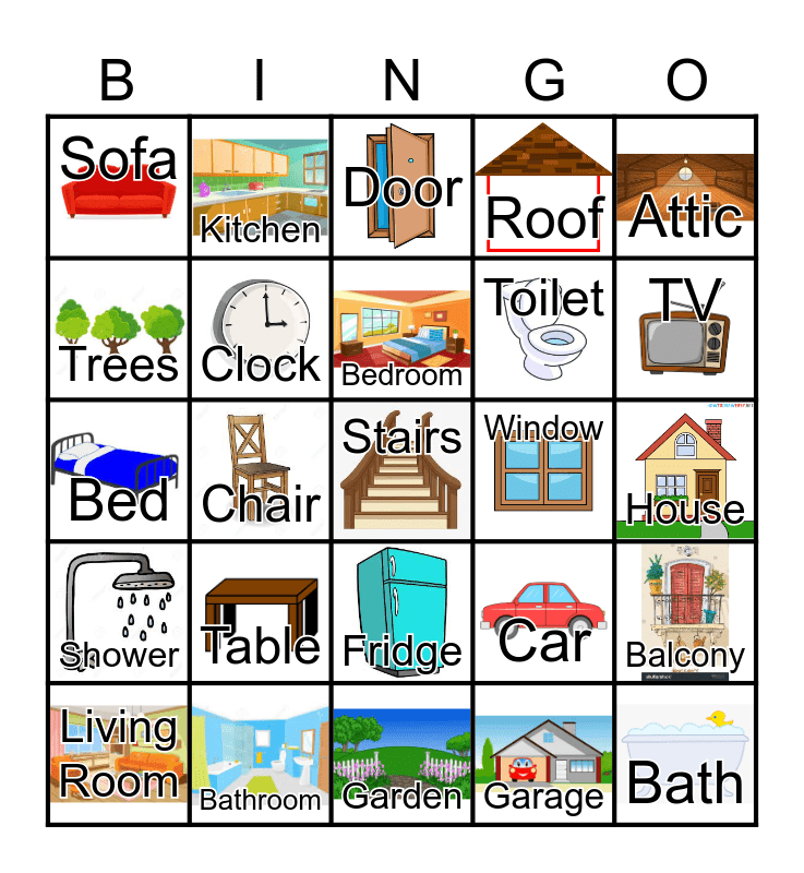 This bingo card has 26 images and 27 words: Living Room, Bathroom, Bedroom, Garage, TV, Sofa, Kitchen, Fridge, Toilet, Bath, Bed, Clock, Garden, Car, House, Flowers, Chair, Door, Window, Attic, Shower, Table, Stairs, Roof, Balcony, Trees and POT.