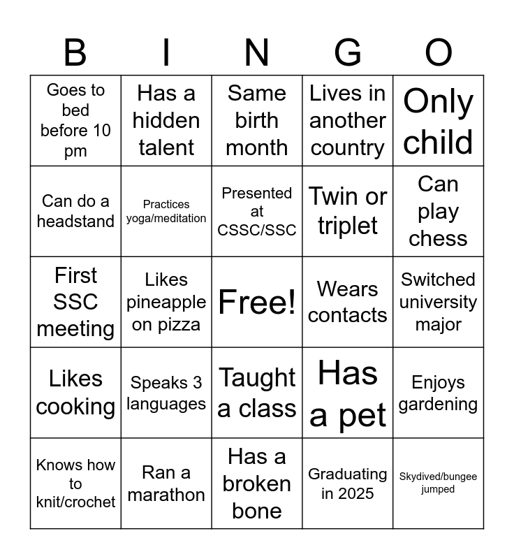 This bingo card has a free space and 24 words: Speaks 3 languages, Ran a marathon, Presented at CSSC/SSC, Knows how to knit/crochet, Only child, Goes to bed before 10 pm, Can do a headstand, Has a hidden talent, Wears contacts, Taught a class, Twin or triplet, First SSC meeting, Has a pet, Enjoys gardening, Practices yoga/meditation, Graduating in 2025, Switched university major, Same birth month, Can play chess, Likes pineapple on pizza, Skydived/bungee jumped, Likes cooking, Lives in another country and Has a broken bone.
