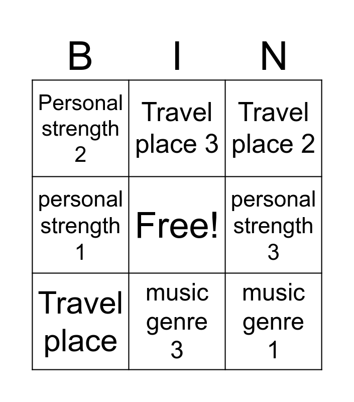 This bingo card has a free space and 9 words: Travel place, Travel place 2, Travel place 3, personal strength 1, Personal strength 2, personal strength 3, music genre 1, music genre 2 and music genre 3.