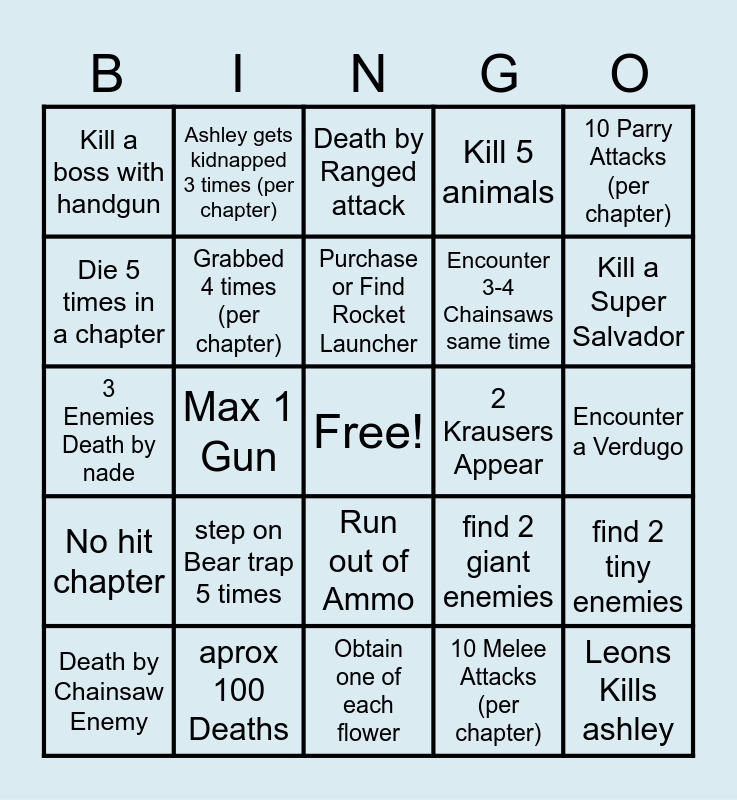 This bingo card has a free space and 24 words: Death by Chainsaw Enemy, step on Bear trap 5 times, Purchase or Find Rocket Launcher, 10 Melee Attacks (per chapter), 10 Parry Attacks (per chapter), Kill a boss with handgun, Ashley gets kidnapped 3 times (per chapter), Death by Ranged attack, 2 Krausers Appear, Encounter a Verdugo, 3 Enemies Death by nade, Grabbed 4 times (per chapter), find 2 giant enemies, find 2 tiny enemies, Die 5 times in a chapter, aprox 100 Deaths, Obtain one of each flower, Kill 5 animals, Kill a Super Salvador, No hit chapter, Max 1 Gun, Run out of Ammo, Encounter 3-4 Chainsaws same time and Leons Kills ashley.