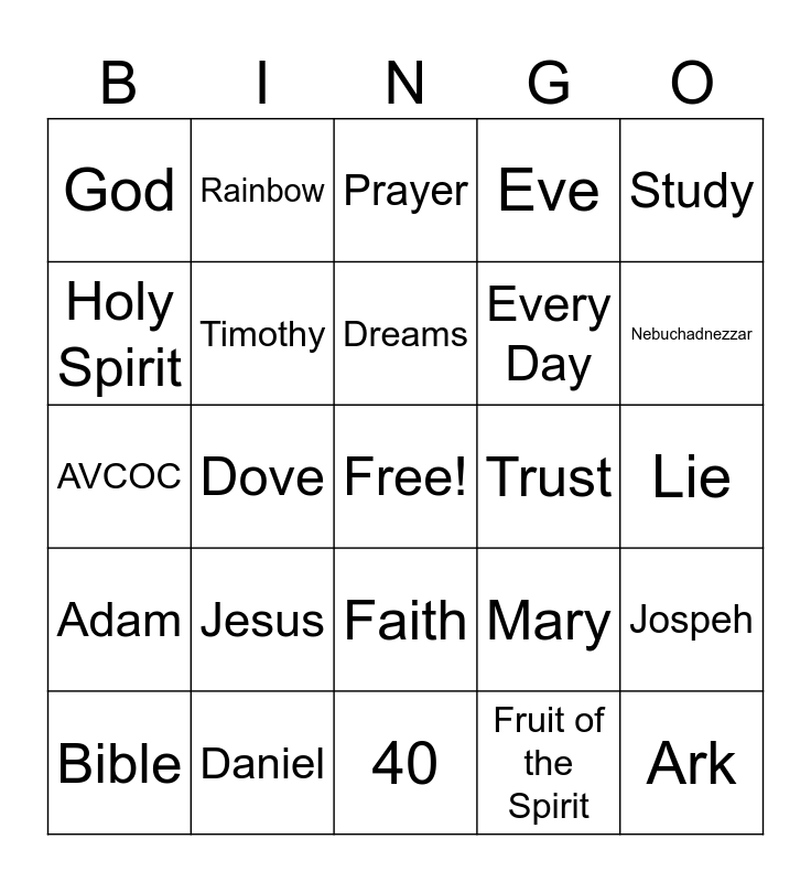 This bingo card has a free space and 24 words: Jesus, Daniel, Dreams, Bible, Study, God, Holy Spirit, Rainbow, Trust, Faith, Every Day, AVCOC, Mary, Jospeh, Timothy, Fruit of the Spirit, Lie, Prayer, Nebuchadnezzar, Dove, Ark, Adam, Eve and 40.