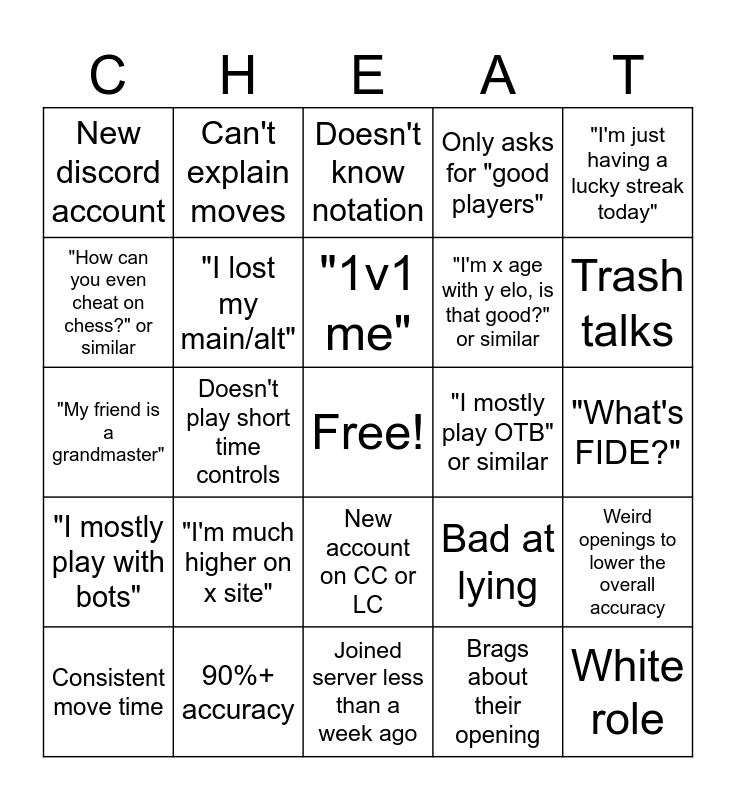 This bingo card has a free space and 24 words: "I'm much higher on x site", 90%+ accuracy, "1v1 me", Consistent move time, "I'm just having a lucky streak today", New discord account, "How can you even cheat on chess?" or similar, Can't explain moves, "I mostly play OTB" or similar, New account on CC or LC, "I'm x age with y elo, is that good?" or similar, "My friend is a grandmaster", Bad at lying, Weird openings to lower the overall accuracy, "I lost my main/alt", Brags about their opening, "What's FIDE?", Doesn't know notation, Trash talks, Doesn't play short time controls, White role, "I mostly play with bots", Only asks for "good players" and Joined server less than a week ago.