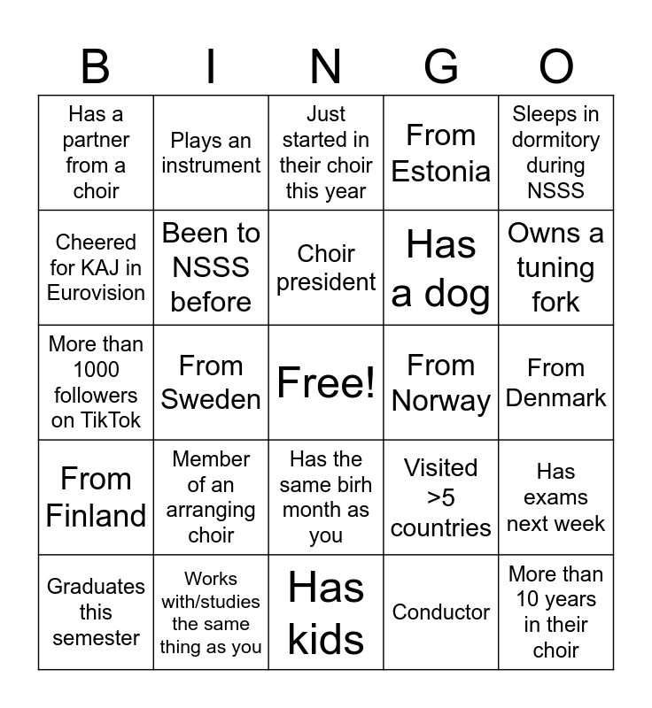 This bingo card has a free space and 24 words: Member of an arranging choir, Works with/studies the same thing as you, Choir president, Graduates this semester, Sleeps in dormitory during NSSS, Has a partner from a choir, Cheered for KAJ in Eurovision, Plays an instrument, From Norway, Has the same birh month as you, Has a dog, More than 1000 followers on TikTok, Visited >5 countries, Has exams next week, Been to NSSS before, Conductor, From Denmark, Just started in their choir this year, Owns a tuning fork, From Sweden, More than 10 years in their choir, From Finland, From Estonia and Has kids.