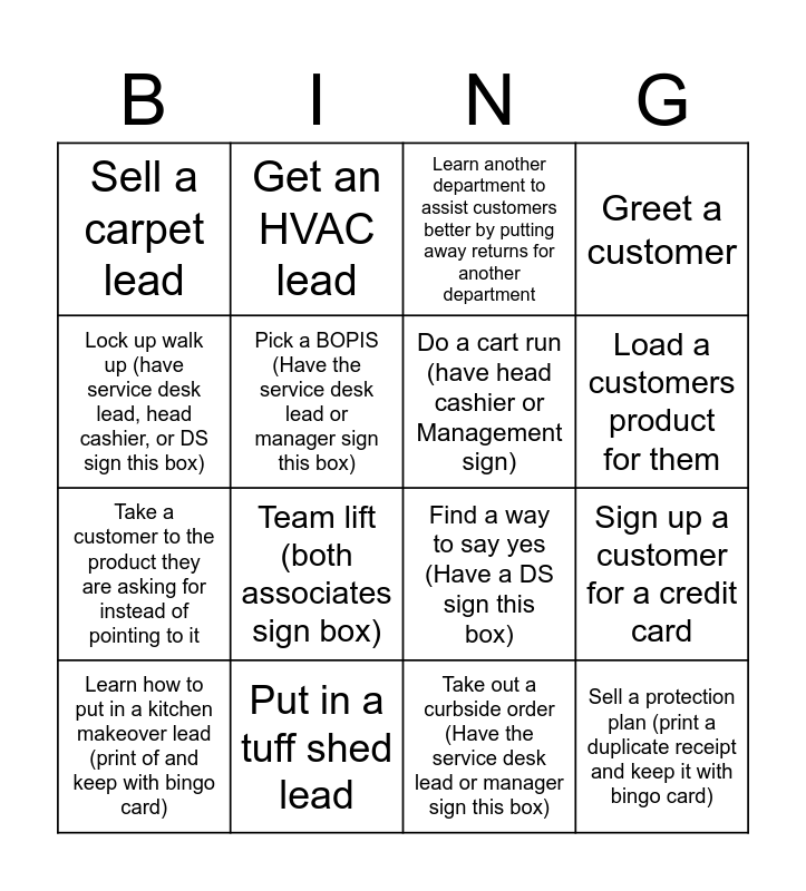 This bingo card has 16 words: Put in a tuff shed lead, Sign up a customer for a credit card, Learn another department to assist customers better by putting away returns for another department, Sell a carpet lead, Take a customer to the product they are asking for instead of pointing to it, Get an HVAC lead, Find a way to say yes (Have a DS sign this box), Take out a curbside order (Have the service desk lead or manager sign this box), Lock up walk up (have service desk lead, head cashier, or DS sign this box), Pick a BOPIS (Have the service desk lead or manager sign this box), Learn how to put in a kitchen makeover lead (print of and keep with bingo card), Greet a customer, Team lift (both associates sign box), Load a customers product for them, Do a cart run (have head cashier or Management sign) and Sell a protection plan (print a duplicate receipt and keep it with bingo card).