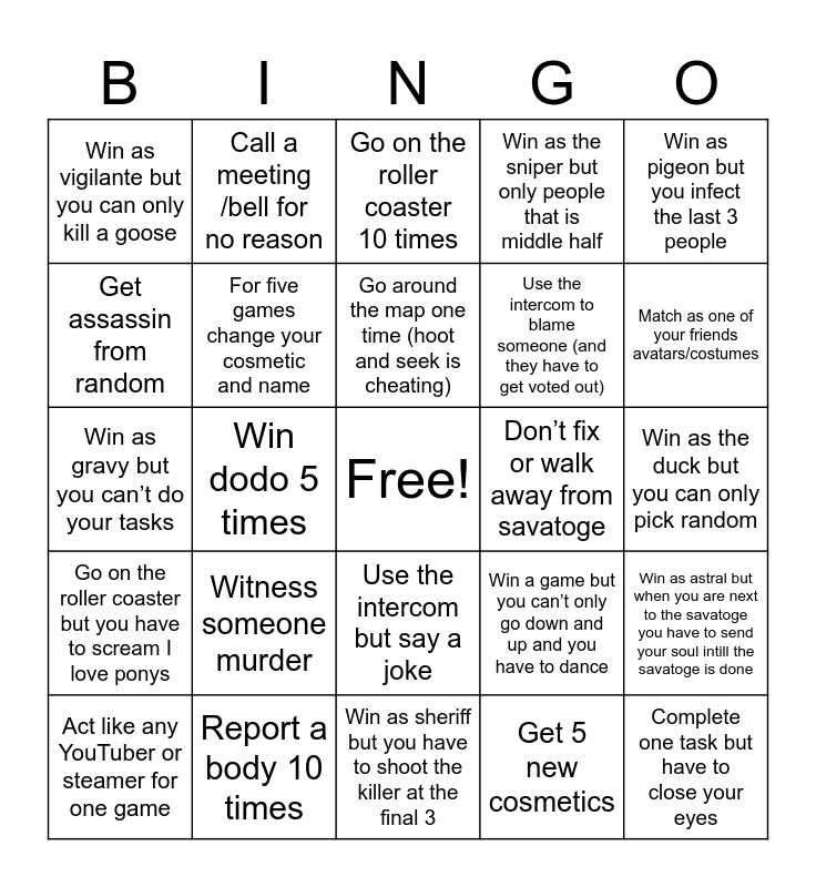 This bingo card has a free space and 24 words: Witness someone murder, Report a body 10 times, Go around the map one time (hoot and seek is cheating), Act like any YouTuber or steamer for one game, Win as pigeon but you infect the last 3 people, Win as vigilante but you can only kill a goose, Get assassin from random, Call a meeting /bell for no reason, Don’t fix or walk away from savatoge, Use the intercom but say a joke, Use the intercom to blame someone (and they have to get voted out), Win as gravy but you can’t do your tasks, Win a game but you can’t only go down and up and you have to dance, Win as astral but when you are next to the savatoge you have to send your soul intill the savatoge is done, For five games change your cosmetic and name, Get 5 new cosmetics, Win as the duck but you can only pick random, Go on the roller coaster 10 times, Match as one of your friends avatars/costumes, Win dodo 5 times, Complete one task but have to close your eyes, Go on the roller coaster but you have to scream I love ponys, Win as the sniper but only people that is middle half and Win as sheriff but you have to shoot the killer at the final 3.