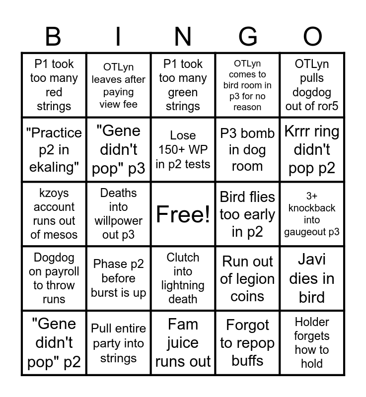 This bingo card has a free space and 24 words: Phase p2 before burst is up, Pull entire party into strings, Lose 150+ WP in p2 tests, "Gene didn't pop" p2, OTLyn pulls dogdog out of ror5, P1 took too many red strings, "Practice p2 in ekaling", OTLyn leaves after paying view fee, Bird flies too early in p2, Clutch into lightning death, P3 bomb in dog room, kzoys account runs out of mesos, Run out of legion coins, Javi dies in bird, "Gene didn't pop" p3, Forgot to repop buffs, 3+ knockback into gaugeout p3, P1 took too many green strings, Krrr ring didn't pop p2, Deaths into willpower out p3, Holder forgets how to hold, Dogdog on payroll to throw runs, OTLyn comes to bird room in p3 for no reason and Fam juice runs out.