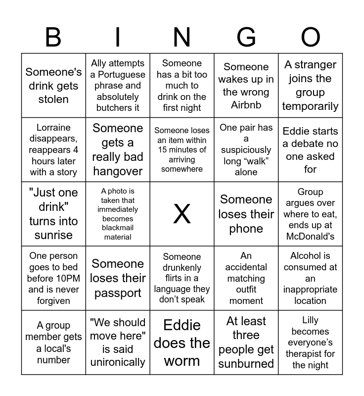 This bingo card has a free space and 26 words: Someone drunkenly flirts in a language they don’t speak, At least three people get sunburned, Someone loses an item within 15 minutes of arriving somewhere, "We should move here" is said unironically, A stranger joins the group temporarily, Someone's drink gets stolen, Lorraine disappears, reappears 4 hours later with a story, Ally attempts a Portuguese phrase and absolutely butchers it, Group argues over where to eat, ends up at McDonald's, An accidental matching outfit moment, One pair has a suspiciously long “walk” alone, "Just one drink" turns into sunrise, Alcohol is consumed at an inappropriate location, A group member gets a local's number, A photo is taken that immediately becomes blackmail material, A bold tattoo idea is very seriously considered, Someone wakes up in the wrong Airbnb, One person goes to bed before 10PM and is never forgiven, Someone has a bit too much to drink on the first night, Lilly becomes everyone’s therapist for the night, Eddie starts a debate no one asked for, Eddie does the worm, Someone loses their phone, Someone loses their passport, Someone gets a really bad hangover and Illegal substances get purchased.