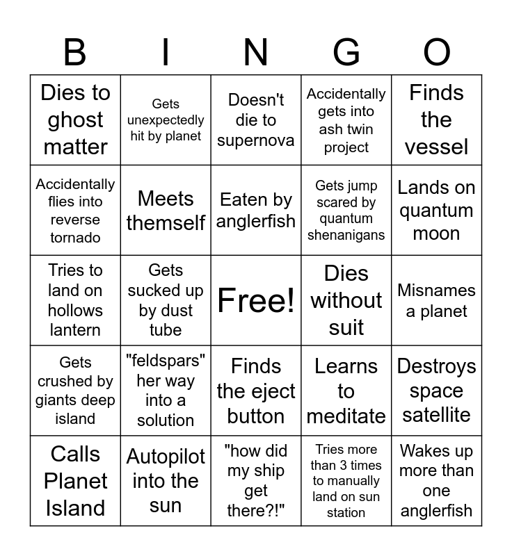 This bingo card has a free space and 31 words: Destroys the timeline, Autopilot into the sun, Eaten by anglerfish, Blames X for causing the supernova, Finds the vessel, Dies to ghost matter, Gets sucked up by dust tube, "how did my ship get there?!", Gets jump scared by quantum shenanigans, Wakes up more than one anglerfish, Calls Planet Island, "feldspars" her way into a solution, Tries more than 3 times to manually land on sun station, Dies within 60 seconds, Gets crushed by giants deep island, Ship self-destructs, Finds the eject button, Dies without suit, Misnames a planet, Falls in black hole, Gets unexpectedly hit by planet, Uses oxygen as fuel, Learns to meditate, Lands on quantum moon, Tries to land on hollows lantern, Meets themself, Doesn't die to supernova, Accidentally gets into ash twin project, Destroys space satellite, Accidentally flies into reverse tornado and Dies with the core inhand.