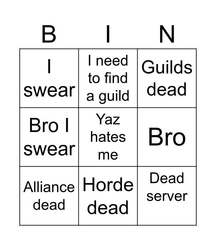 This bingo card has a free space and 8 words: Bro, Guilds dead, I need to find a guild, Alliance dead, I swear, Dead server, Bro I swear and Horde dead.