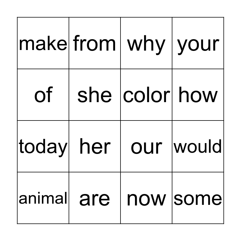 This bingo card has a free space and 15 words: animal, some, why, make, how, of, her, now, she, today, would, your, color, from and are.
