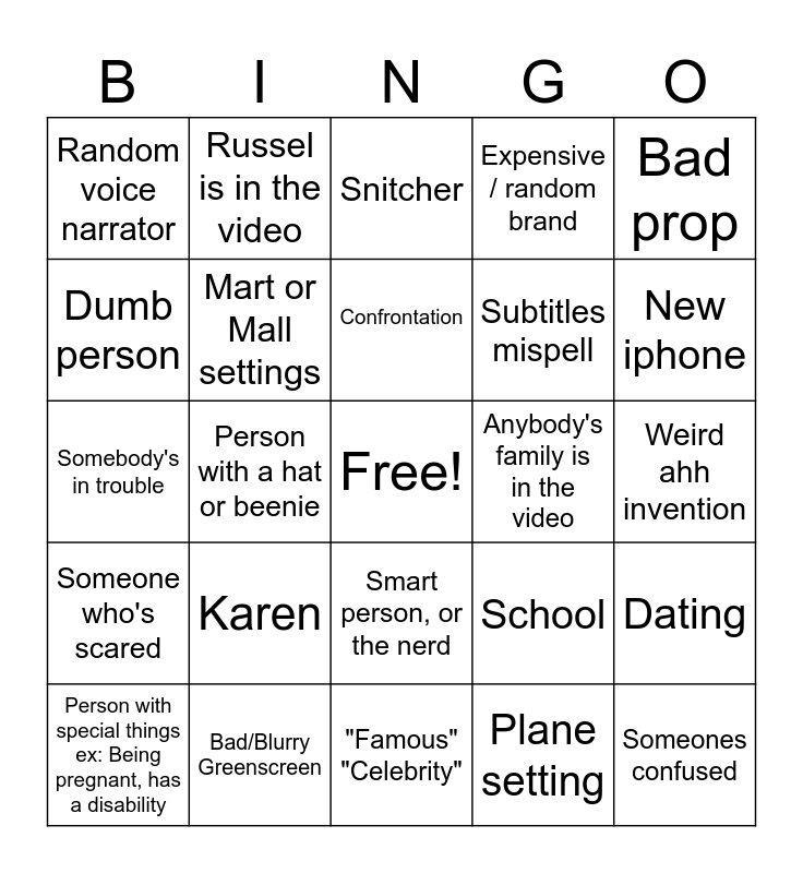 This bingo card has a free space and 24 words: Karen, Bad/Blurry Greenscreen, Confrontation, Person with special things ex: Being pregnant, has a disability, Bad prop, Random voice narrator, Dumb person, Russel is in the video, Anybody's family is in the video, Smart person, or the nerd, Subtitles mispell, Somebody's in trouble, School, Dating, Mart or Mall settings, Plane setting, Weird ahh invention, Snitcher, New iphone, Person with a hat or beenie, Someones confused, Someone who's scared, Expensive / random brand and "Famous" "Celebrity".