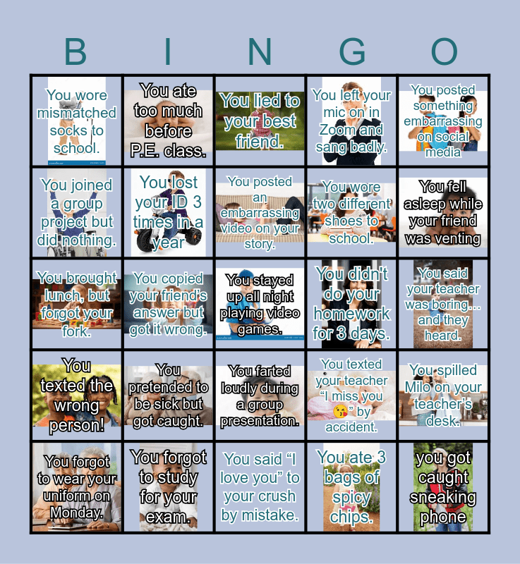 This bingo card has 24 images and 25 words: You texted the wrong person!, You forgot to study for your exam., You stayed up all night playing video games., You ate 3 bags of spicy chips., You posted something embarrassing on social media, You wore mismatched socks to school., You ate too much before P.E. class., You lied to your best friend., You didn't do your homework for 3 days., You spilled Milo on your teacher’s desk., You joined a group project but did nothing., You lost your ID 3 times in a year, You said “I love you” to your crush by mistake., You texted your teacher “I miss you 😘” by accident., You fell asleep while your friend was venting, You forgot to wear your uniform on Monday., You copied your friend’s answer but got it wrong., You posted an embarrassing video on your story., You wore two different shoes to school., You said your teacher was boring… and they heard., You brought lunch, but forgot your fork., You pretended to be sick but got caught., You farted loudly during a group presentation., You left your mic on in Zoom and sang badly. and you got caught sneaking phone.