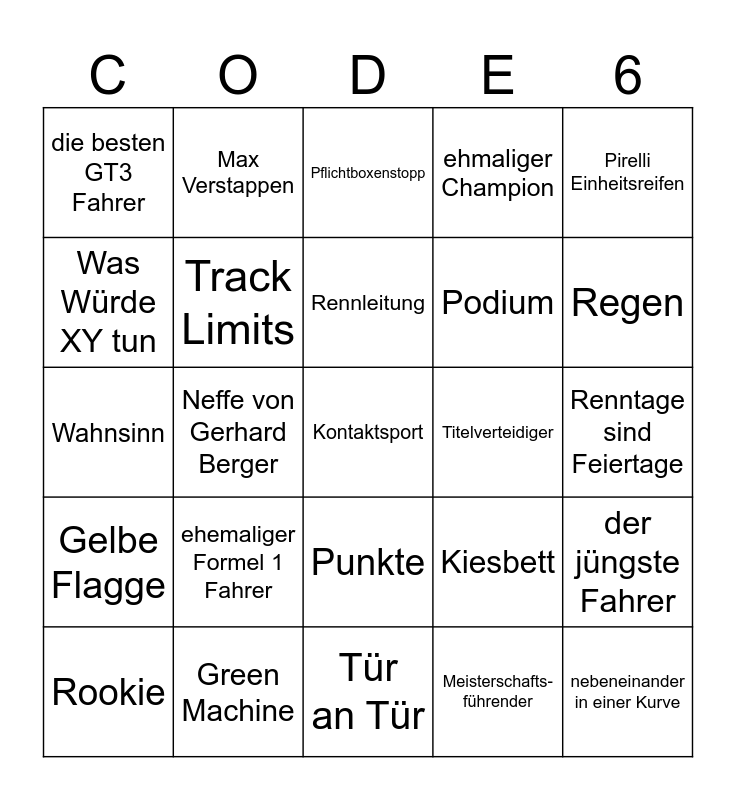 This bingo card has a free space and 24 words: ehemaliger Formel 1 Fahrer, Green Machine, Rennleitung, Rookie, Pirelli Einheitsreifen, die besten GT3 Fahrer, Was Würde XY tun, Max Verstappen, Titelverteidiger, Punkte, Podium, Wahnsinn, Kiesbett, der jüngste Fahrer, Track Limits, Meisterschafts- führender, Renntage sind Feiertage, Pflichtboxenstopp, Regen, Neffe von Gerhard Berger, nebeneinander in einer Kurve, Gelbe Flagge, ehmaliger Champion and Tür an Tür.