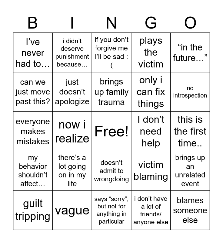 This bingo card has a free space and 24 words: there’s a lot going on in my life, vague, brings up family trauma, guilt tripping, “in the future…”, I’ve never had to…, can we just move past this?, i didn’t deserve punishment because…, I don’t need help, doesn’t admit to wrongdoing, only i can fix things, everyone makes mistakes, victim blaming, brings up an unrelated event, just doesn’t apologize, i don’t have a lot of friends/ anyone else, this is the first time.., if you don’t forgive me i’ll be sad :(, no introspection, now i realize, blames someone else, my behavior shouldn’t affect…, plays the victim and says “sorry”, but not for anything in particular.