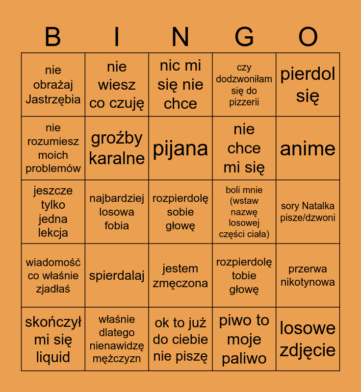 This bingo card has a free space and 24 words: spierdalaj, właśnie dlatego nienawidzę mężczyzn, pijana, skończył mi się liquid, pierdol się, nie obrażaj Jastrzębia, nie rozumiesz moich problemów, nie wiesz co czuję, boli mnie (wstaw nazwę losowej części ciała), jestem zmęczona, nie chce mi się, jeszcze tylko jedna lekcja, rozpierdolę tobie głowę, przerwa nikotynowa, groźby karalne, piwo to moje paliwo, sory Natalka pisze/dzwoni, nic mi się nie chce, anime, najbardziej losowa fobia, losowe zdjęcie, wiadomość co właśnie zjadłaś, czy dodzwoniłam się do pizzerii and ok to już do ciebie nie piszę.