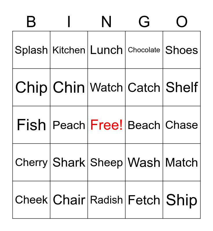This bingo card has a free space and 24 words: Shark, Chair, Watch, Cheek, Shoes, Splash, Chip, Kitchen, Beach, Sheep, Catch, Fish, Wash, Match, Chin, Fetch, Chase, Lunch, Shelf, Peach, Ship, Cherry, Chocolate and Radish.