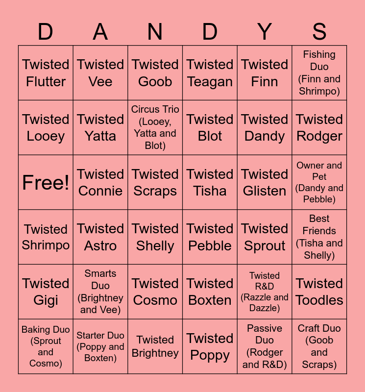 This bingo card has 36 words: Twisted Boxten, Twisted Cosmo, Twisted Poppy, Twisted Looey, Twisted Shrimpo, Twisted Tisha, Twisted Yatta, Twisted Brightney, Twisted Finn, Twisted R&D (Razzle and Dazzle), Twisted Rodger, Twisted Teagan, Twisted Toodles, Twisted Connie, Twisted Blot, Twisted Flutter, Twisted Gigi, Twisted Glisten, Free!, Twisted Goob, Twisted Scraps, Twisted Astro, Twisted Pebble, Twisted Shelly, Twisted Sprout, Twisted Vee, Twisted Dandy, Starter Duo (Poppy and Boxten), Circus Trio (Looey, Yatta and Blot), Fishing Duo (Finn and Shrimpo), Craft Duo (Goob and Scraps), Baking Duo (Sprout and Cosmo), Best Friends (Tisha and Shelly), Owner and Pet (Dandy and Pebble), Smarts Duo (Brightney and Vee) and Passive Duo (Rodger and R&D).