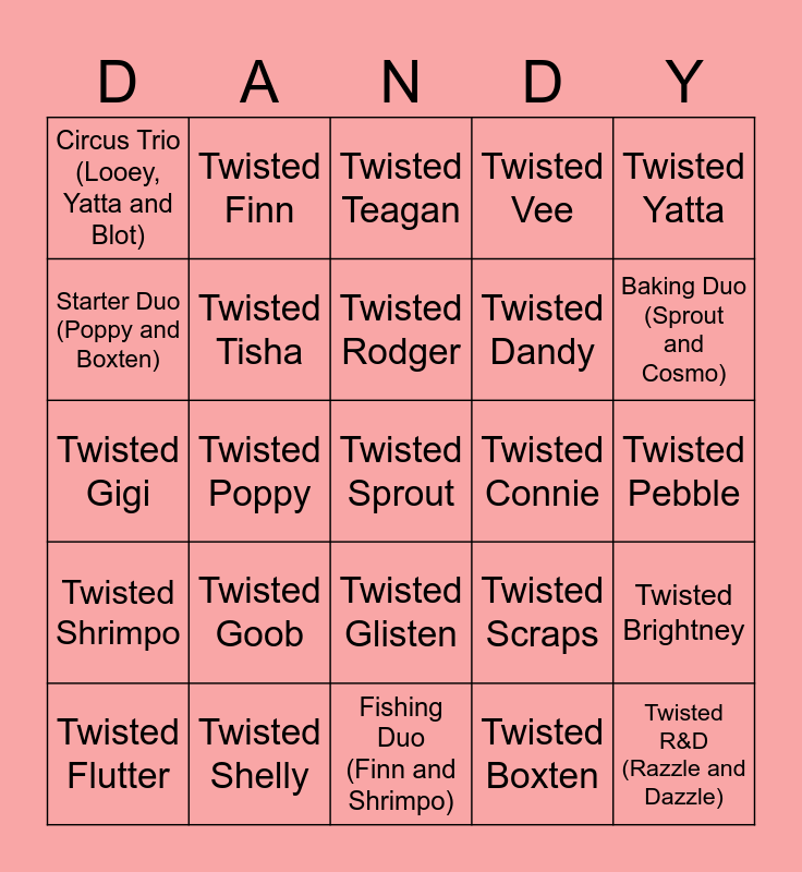 This bingo card has 32 words: Twisted Boxten, Twisted Cosmo, Twisted Poppy, Twisted Looey, Twisted Shrimpo, Twisted Tisha, Twisted Yatta, Twisted Brightney, Twisted Finn, Twisted R&D (Razzle and Dazzle), Twisted Rodger, Twisted Teagan, Free!, Twisted Toodles, Twisted Connie, Twisted Blot, Twisted Flutter, Twisted Gigi, Twisted Glisten, Twisted Goob, Twisted Scraps, Twisted Astro, Twisted Pebble, Twisted Shelly, Twisted Sprout, Twisted Vee, Twisted Dandy, Starter Duo (Poppy and Boxten), Circus Trio (Looey, Yatta and Blot), Fishing Duo (Finn and Shrimpo), Craft Duo (Goob and Scraps) and Baking Duo (Sprout and Cosmo).