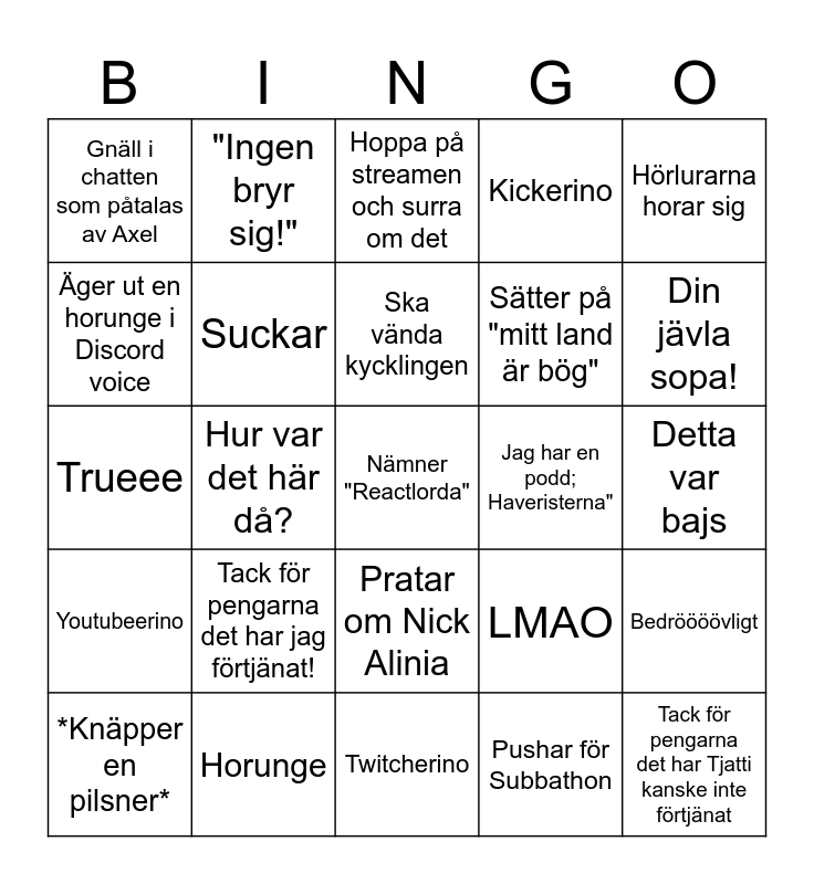 This bingo card has a free space and 24 words: Tack för pengarna det har jag förtjänat!, Horunge, Ska vända kycklingen, *Knäpper en pilsner*, Hörlurarna horar sig, Gnäll i chatten som påtalas av Axel, Äger ut en horunge i Discord voice, "Ingen bryr sig!", Jag har en podd; Haveristerna", Pratar om Nick Alinia, Sätter på "mitt land är bög", Trueee, LMAO, Bedröööövligt, Suckar, Pushar för Subbathon, Detta var bajs, Hoppa på streamen och surra om det, Din jävla sopa!, Hur var det här då?, Tack för pengarna det har Tjatti kanske inte förtjänat, Youtubeerino, Kickerino and Twitcherino.