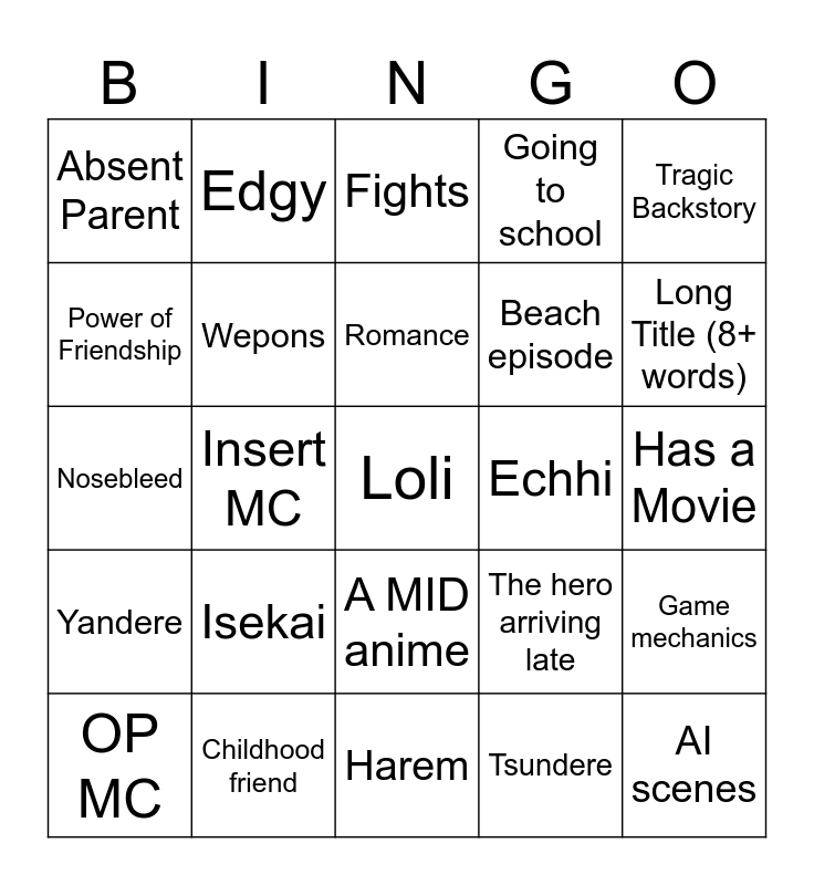 This bingo card has 25 words: Isekai, Harem, Romance, OP MC, Tragic Backstory, Absent Parent, Power of Friendship, Edgy, Echhi, A MID anime, Beach episode, Nosebleed, The hero arriving late, Game mechanics, Wepons, AI scenes, Has a Movie, Fights, Long Title (8+ words), Insert MC, Loli, Childhood friend, Yandere, Going to school and Tsundere.