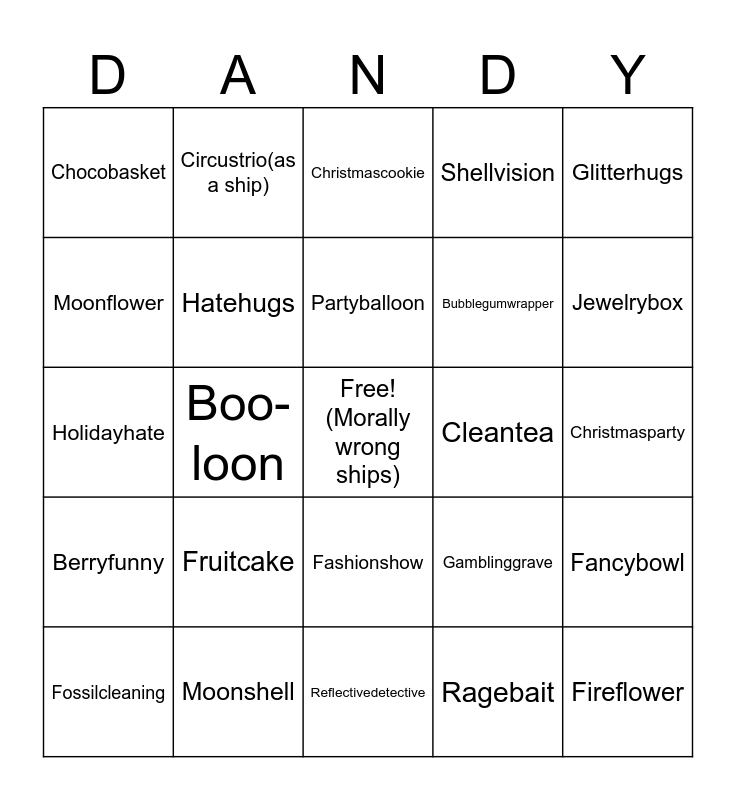 This bingo card has a free space and 24 words: Fruitcake, Moonshell, Partyballoon, Fossilcleaning, Glitterhugs, Chocobasket, Moonflower, Circustrio(as a ship), Cleantea, Fashionshow, Bubblegumwrapper, Holidayhate, Gamblinggrave, Fancybowl, Hatehugs, Ragebait, Christmasparty, Christmascookie, Jewelrybox, Boo-loon, Fireflower, Berryfunny, Shellvision and Reflectivedetective.