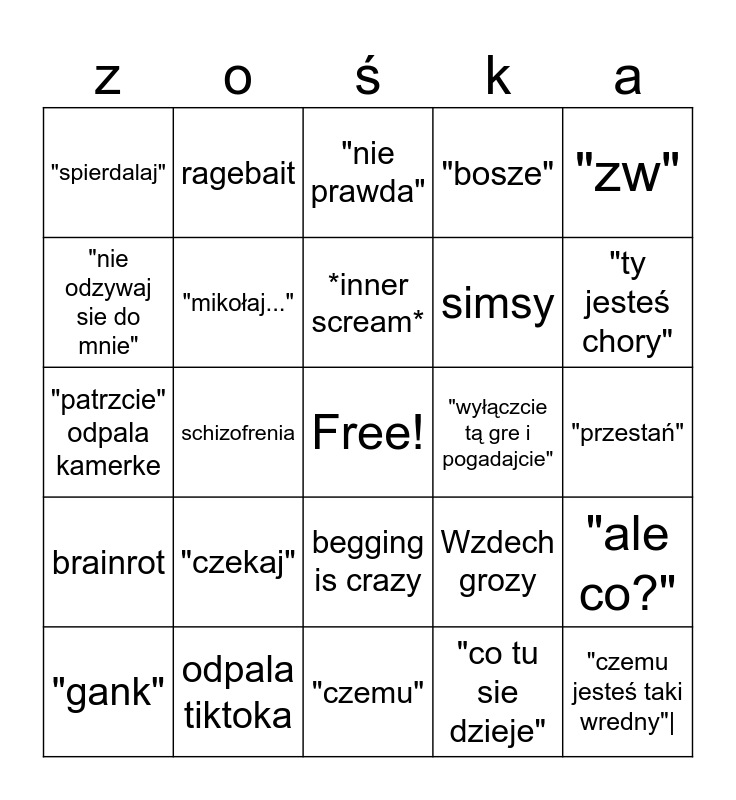 This bingo card has a free space and 24 words: "czekaj", odpala tiktoka, *inner scream*, "gank", "zw", "spierdalaj", "nie odzywaj sie do mnie", ragebait, "wyłączcie tą gre i pogadajcie", begging is crazy, simsy, "patrzcie" odpala kamerke, Wzdech grozy, "ale co?", "mikołaj...", "co tu sie dzieje", "przestań", "nie prawda", "ty jesteś chory", schizofrenia, "czemu jesteś taki wredny"|, brainrot, "bosze" and "czemu".