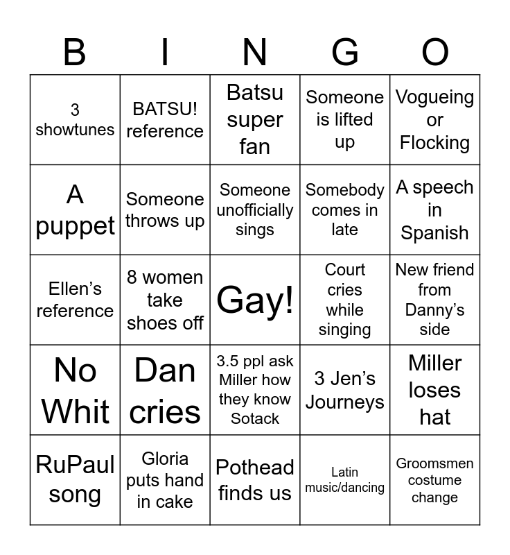This bingo card has a free space and 24 words: Dan cries, Gloria puts hand in cake, Someone unofficially sings, RuPaul song, Vogueing or Flocking, 3 showtunes, A puppet, BATSU! reference, Court cries while singing, 3.5 ppl ask Miller how they know Sotack, Somebody comes in late, Ellen’s reference, 3 Jen’s Journeys, Miller loses hat, Someone throws up, Latin music/dancing, New friend from Danny’s side, Batsu super fan, A speech in Spanish, 8 women take shoes off, Groomsmen costume change, No Whit, Someone is lifted up and Pothead finds us.