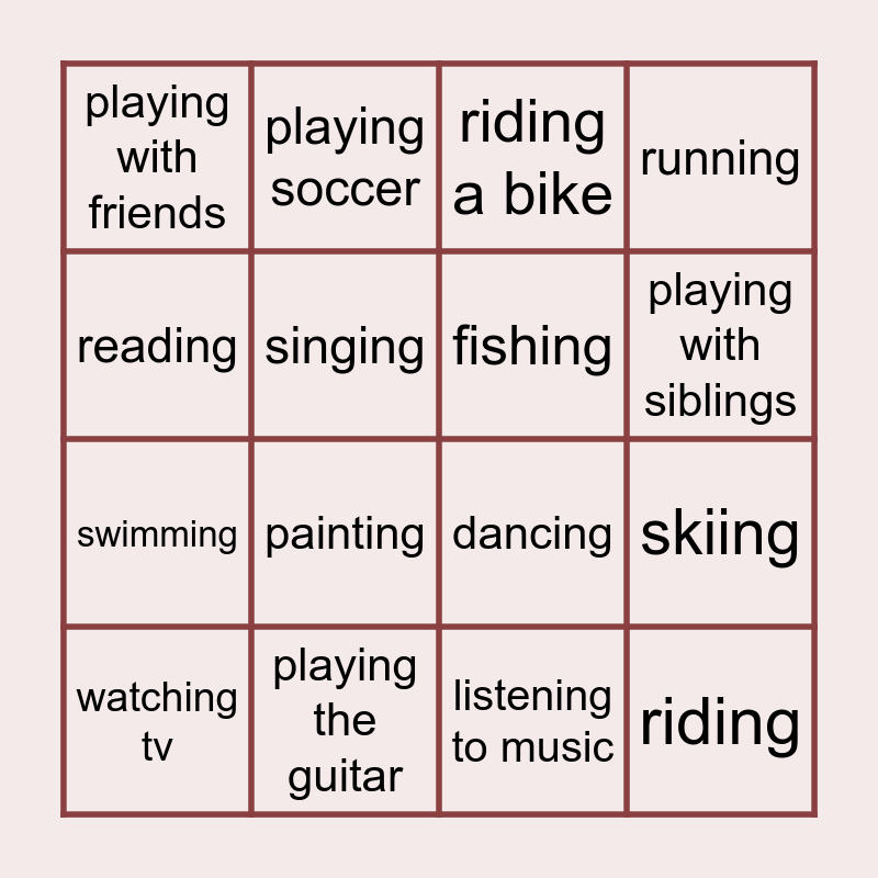This bingo card has 16 words: playing the guitar, skiing, riding a bike, playing with friends, swimming, playing soccer, dancing, listening to music, reading, singing, watching tv, running, painting, playing with siblings, fishing and riding.