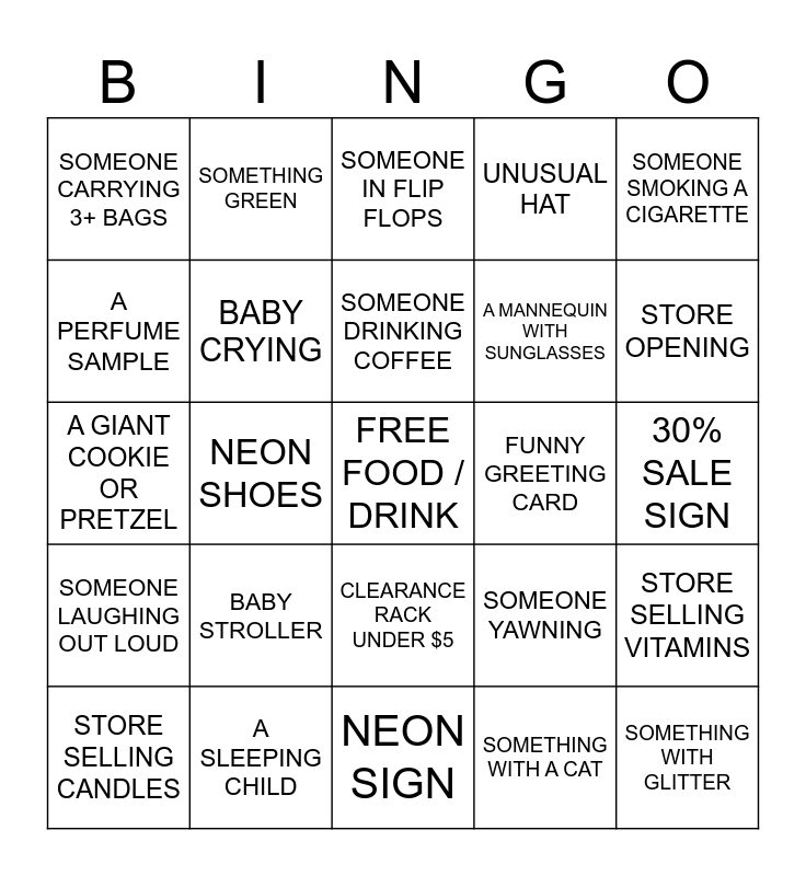 This bingo card has 25 words: BABY STROLLER, NEON SIGN, SOMEONE DRINKING COFFEE, STORE SELLING CANDLES, SOMEONE SMOKING A CIGARETTE, SOMEONE CARRYING 3+ BAGS, A PERFUME SAMPLE, SOMETHING GREEN, FUNNY GREETING CARD, CLEARANCE RACK UNDER $5, A MANNEQUIN WITH SUNGLASSES, A GIANT COOKIE OR PRETZEL, SOMEONE YAWNING, STORE SELLING VITAMINS, BABY CRYING, SOMETHING WITH GLITTER, 30% SALE SIGN, SOMEONE IN FLIP FLOPS, STORE OPENING, NEON SHOES, FREE FOOD / DRINK, A SLEEPING CHILD, SOMEONE LAUGHING OUT LOUD, UNUSUAL HAT and SOMETHING WITH A CAT.