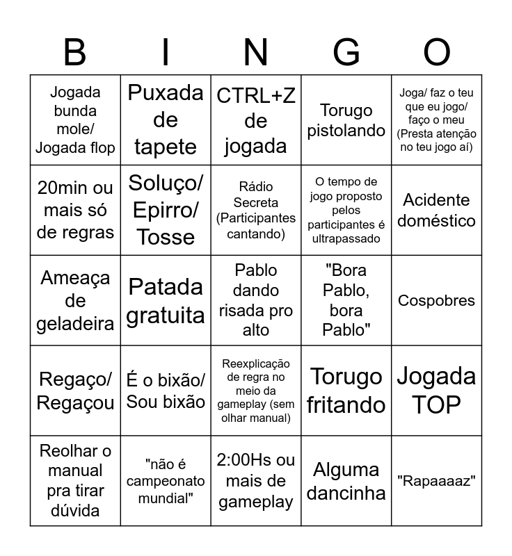 This bingo card has 39 words: Torugo 1° Jogador, Pablo 1° Jogador, Algum gato aparecendo/ miando, Soluço/ Epirro/ Tosse, Reolhar o manual pra tirar dúvida, Reexplicação de regra no meio da gameplay (sem olhar manual), Rádio Secreta (Participantes cantando), Coquinha + cervejinha, Joga/ faz o teu que eu jogo/ faço o meu (Presta atenção no teu jogo aí), Regaço/ Regaçou, Patada gratuita, Torugo pistolando, Pablo dando risada pro alto, Cospobres, "Bora Pablo, bora Pablo", É o bixão/ Sou bixão, Noooooossa, Jogada bunda mole/ Jogada flop, Pablo fritando, Torugo fritando, 20min ou mais só de regras, 2:00Hs ou mais de gameplay, O tempo de jogo proposto pelos participantes é ultrapassado, Acidente doméstico, Júlia não tá jogando, mas aparece na live, Live atrasada, "Rapaaaaz", "Cavaaalo", Vai, vai, vai, vai, vai, vai, vai., Puxada de tapete, Alguém "conferindo" jogo do coleguinha,, O jogo é ganho por uma diferença mínima (até 3 pontos), CTRL+Z de jogada, "não é campeonato mundial", Alguma dancinha, Já tô mal, Jogada TOP, Ameaça de geladeira and Pablo falando "Exelente".