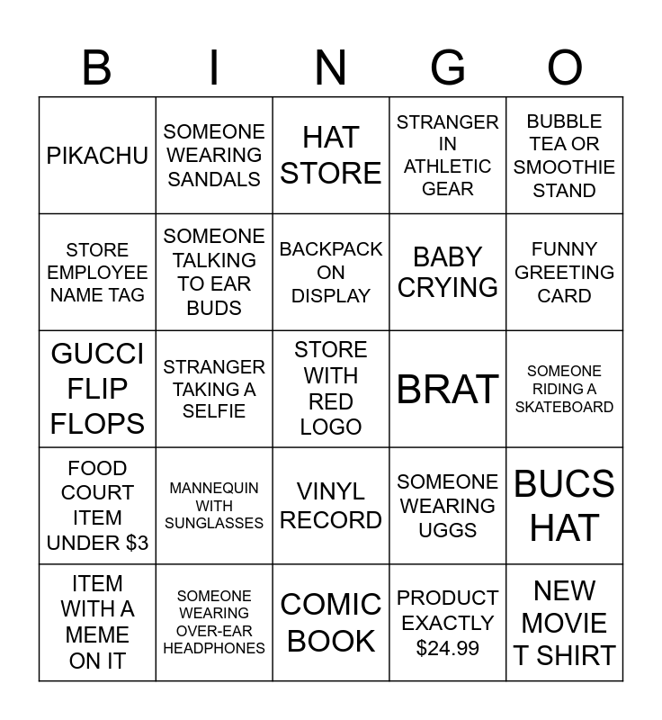 This bingo card has a free space and 24 words: MANNEQUIN WITH SUNGLASSES, SOMEONE WEARING OVER-EAR HEADPHONES, BACKPACK ON DISPLAY, ITEM WITH A MEME ON IT, BUBBLE TEA OR SMOOTHIE STAND, PIKACHU, STORE EMPLOYEE NAME TAG, SOMEONE WEARING SANDALS, BRAT, VINYL RECORD, BABY CRYING, GUCCI FLIP FLOPS, SOMEONE WEARING UGGS, BUCS HAT, SOMEONE TALKING TO EAR BUDS, PRODUCT EXACTLY $24.99, SOMEONE RIDING A SKATEBOARD, HAT STORE, FUNNY GREETING CARD, STRANGER TAKING A SELFIE, NEW MOVIE T SHIRT, FOOD COURT ITEM UNDER $3, STRANGER IN ATHLETIC GEAR and COMIC BOOK.
