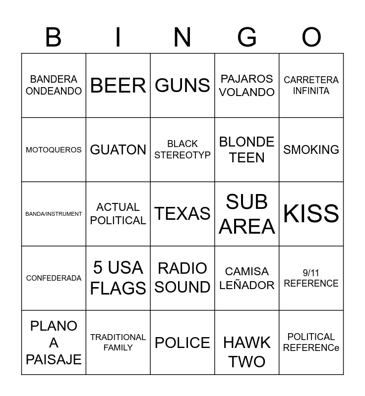 This bingo card has a free space and 24 words: 5 USA FLAGS, TRADITIONAL FAMILY, BLACK STEREOTYP, PLANO A PAISAJE, CARRETERA INFINITA, BANDERA ONDEANDO, MOTOQUEROS, BEER, SUB AREA, RADIO SOUND, BLONDE TEEN, BANDA/INSTRUMENT, CAMISA LEÑADOR, 9/11 REFERENCE, GUATON, HAWK TWO, KISS, GUNS, SMOKING, ACTUAL POLITICAL, POLITICAL REFERENCe, CONFEDERADA, PAJAROS VOLANDO and POLICE.