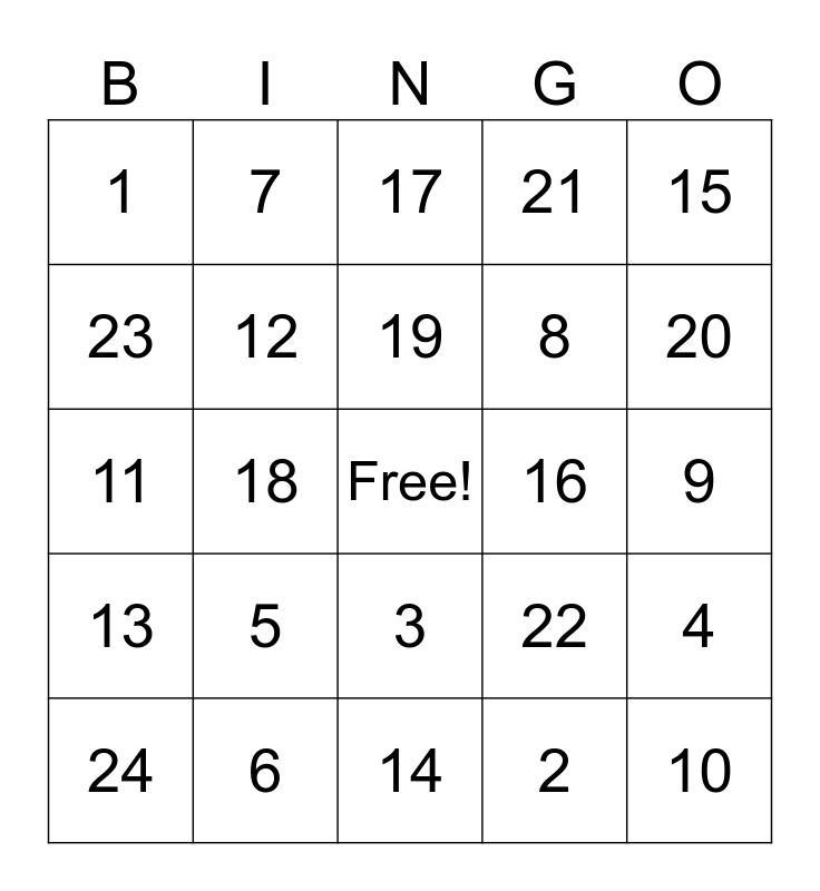 This bingo card has a free space and 24 words: 5, 6, 19, 24, 15, 1, 23, 7, 16, 3, 8, 11, 22, 4, 12, 2, 9, 17, 20, 18, 10, 13, 21 and 14.
