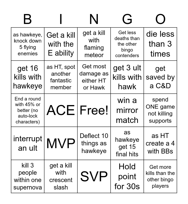 This bingo card has a free space and 24 words: MVP, get a kill with crescent slash, Get most damage as either HT or Hawk, kill 3 people within one supernova, die less than 3 times, as hawkeye, knock down 5 flying enemies, get 16 kills with hawkeye, Get a kill with the E ability, win a mirror match, Deflect 10 things as hawkeye, get 3 ult kills with hawk, End a round with 45% or better (no auto-lock characters), as hawkeye get 15 final hits, as HT create a 4 with BBs, as HT, spot another fantastic member, Hold point for 30s, spend ONE game not killing supports, get a kill with flaming meteor, get saved by a C&D, ACE, Get more kills than the other bingo players, interrupt an ult, Get less deaths than the other bingo contenders and SVP.
