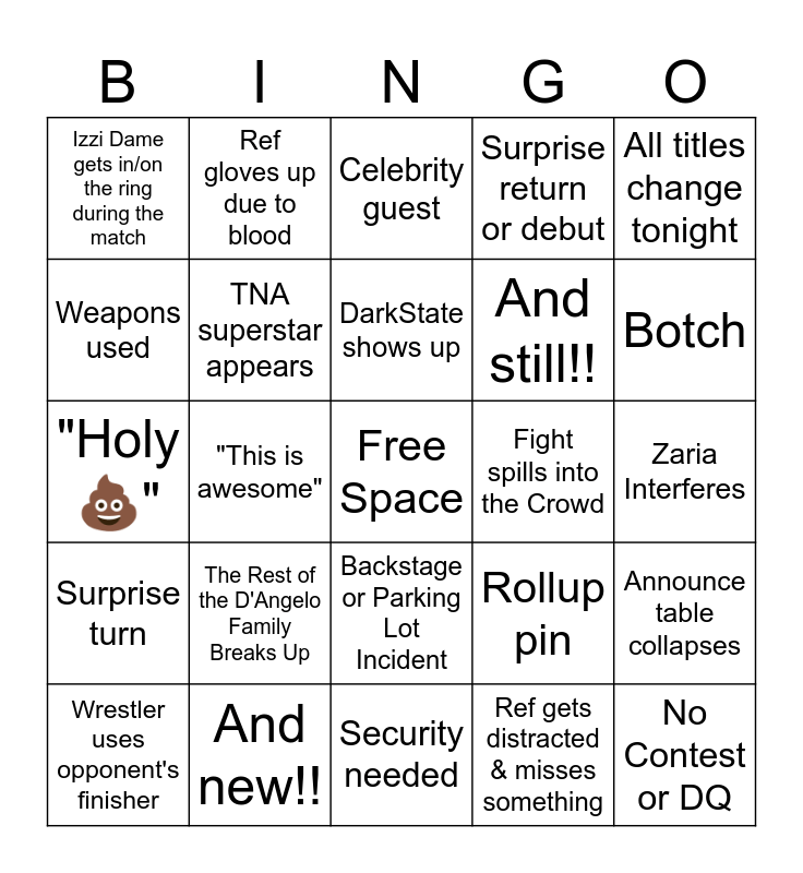 This bingo card has a free space and 27 words: Rollup pin, Kelani goes full-on heel, And still!!, Security needed, Weapons used, Celebrity guest, Ref gloves up due to blood, Surprise turn, Fight spills into the Crowd, Announce table collapses, "Holy 💩", Surprise return or debut, Wrestler uses opponent's finisher, And new!!, Botch, Jordynne Grace hulks out, TNA superstar appears, DarkState shows up, The Rest of the D'Angelo Family Breaks Up, Izzi Dame gets in/on the ring during the match, Zaria Interferes, Ref gets distracted & misses something, "This is awesome", No Contest or DQ, Backstage or Parking Lot Incident, All titles change tonight and Surprise interference.