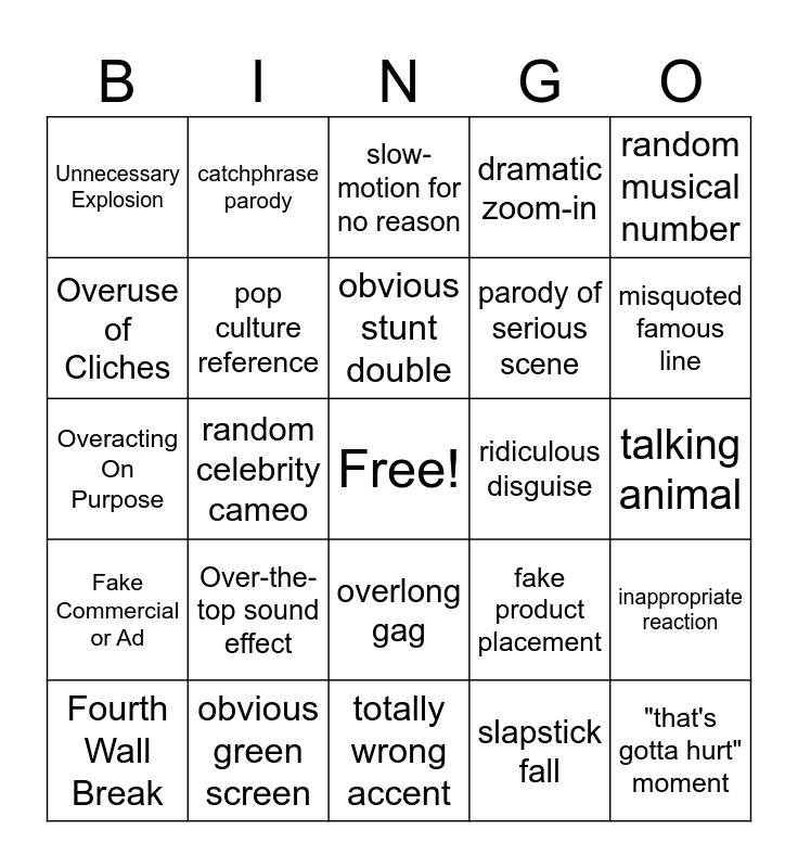This bingo card has a free space and 24 words: Fourth Wall Break, Over-the-top sound effect, obvious stunt double, slapstick fall, random musical number, Unnecessary Explosion, catchphrase parody, slow-motion for no reason, ridiculous disguise, talking animal, Overacting On Purpose, pop culture reference, fake product placement, inappropriate reaction, Overuse of Cliches, obvious green screen, totally wrong accent, dramatic zoom-in, misquoted famous line, Fake Commercial or Ad, random celebrity cameo, overlong gag, parody of serious scene and "that's gotta hurt" moment.