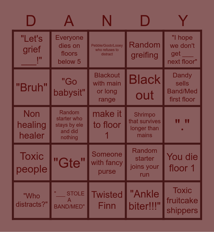 This bingo card has a free space and 24 words: "Gte", "___ STOLE A BAND/MED", Blackout with main or long range, "Who distracts?", "I hope we don't get ___ next floor", "Let's grief ___!", "Bruh", Everyone dies on floors below 5, Shrimpo that survives longer than mains, Someone with fancy purse, Black out, Non healing healer, Random starter joins your run, You die floor 1, "Go babysit", "Ankle biter!!!", ".", Pebble/Goob/Looey who refuses to distract, Dandy sells Band/Med first floor, Random starter who stays by ele and did nothing, Toxic fruitcake shippers, Toxic people, Random greifing and Twisted Finn.
