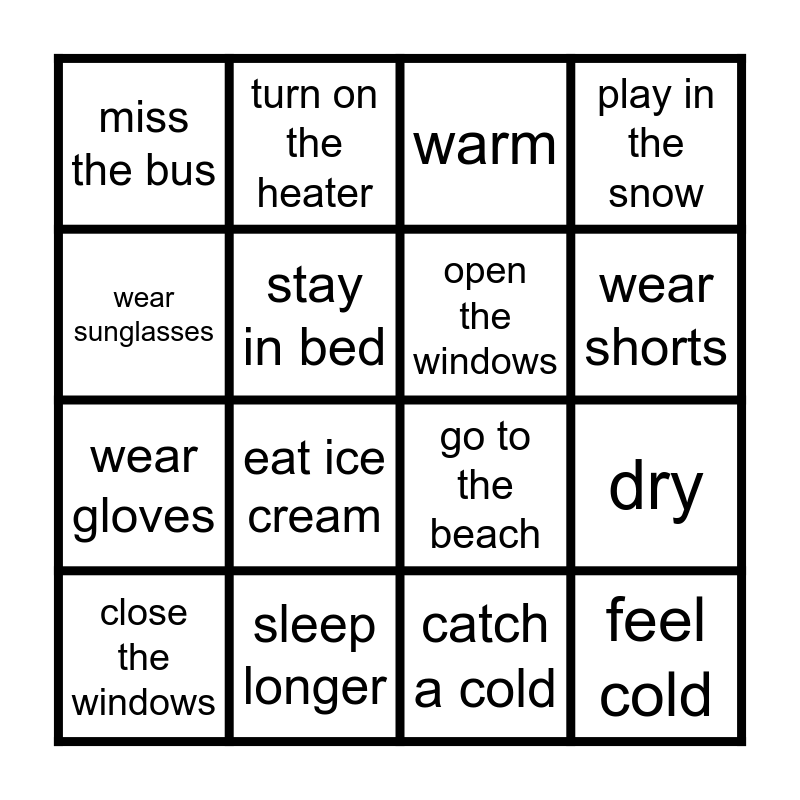 This bingo card has 20 words: dry, wet, warm, freezing, close the windows, wear sunglasses, sleep longer, miss the bus, wear gloves, turn on the heater, eat ice cream, go to the beach, stay in bed, feel cold, open the windows, ride a bike, wear shorts, play in the snow, catch a cold and go swimming.