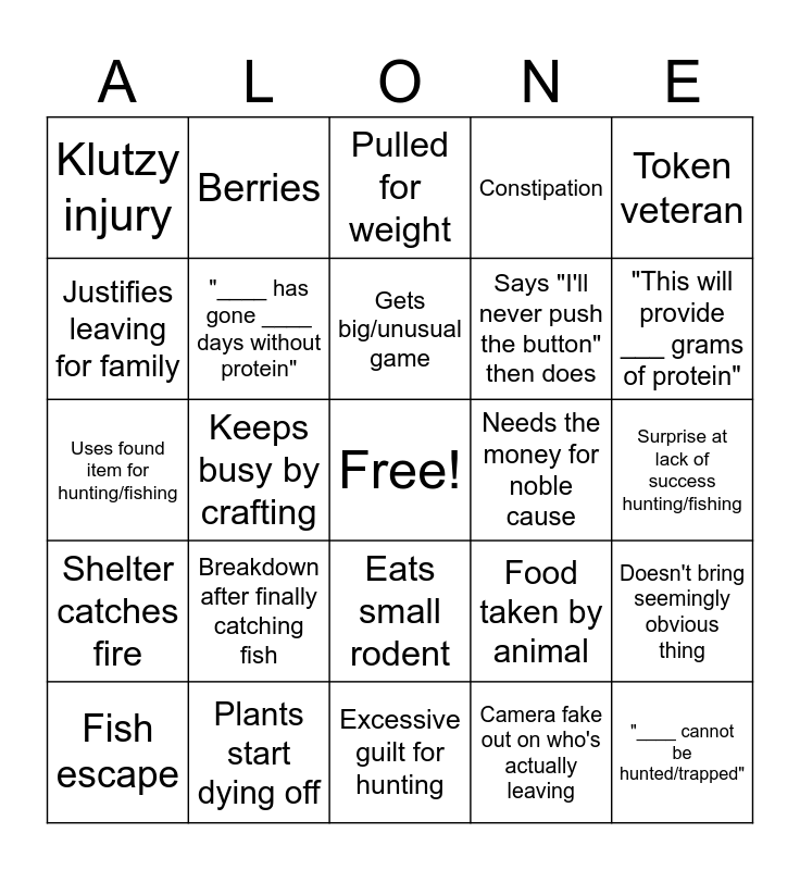 This bingo card has a free space and 29 words: Fish escape, Wants to prove that women can win this, Keeps busy by crafting, Professional hunter/trapper /tour guide, Klutzy injury, Pulled for weight, "____ has gone ____ days without protein", Breakdown after finally catching fish, Needs the money for noble cause, Plants start dying off, Surprise at lack of success hunting/fishing, "____ cannot be hunted/trapped", Excessive guilt for hunting, Camera fake out on who's actually leaving, "This will provide ___ grams of protein", Crunchy plant lady, Eats small rodent, Shelter catches fire, Token veteran, Uses found item for hunting/fishing, Food taken by animal, Wanted to go to prove themselves, Says "I'll never push the button" then does, Justifies leaving for family, Constipation, Berries, Doesn't bring seemingly obvious thing, Gets big/unusual game and Loses important thing.