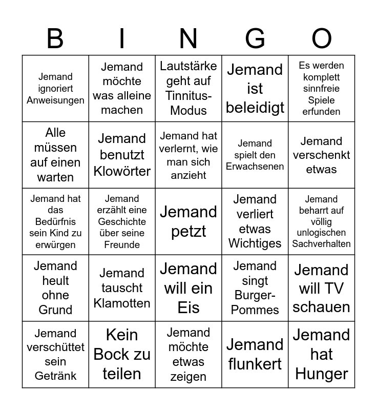 This bingo card has 25 words: Jemand heult ohne Grund, Kein Bock zu teilen, Jemand petzt, Jemand flunkert, Es werden komplett sinnfreie Spiele erfunden, Jemand ignoriert Anweisungen, Jemand möchte was alleine machen, Lautstärke geht auf Tinnitus-Modus, Jemand verliert etwas Wichtiges, Jemand will TV schauen, Alle müssen auf einen warten, Jemand benutzt Klowörter, Jemand möchte etwas zeigen, Jemand singt Burger-Pommes, Jemand verschenkt etwas, Jemand verschüttet sein Getränk, Jemand erzählt eine Geschichte über seine Freunde, Jemand hat verlernt, wie man sich anzieht, Jemand spielt den Erwachsenen, Jemand beharrt auf völlig unlogischen Sachverhalten, Jemand hat das Bedürfnis sein Kind zu erwürgen, Jemand tauscht Klamotten, Jemand will ein Eis, Jemand ist beleidigt and Jemand hat Hunger.