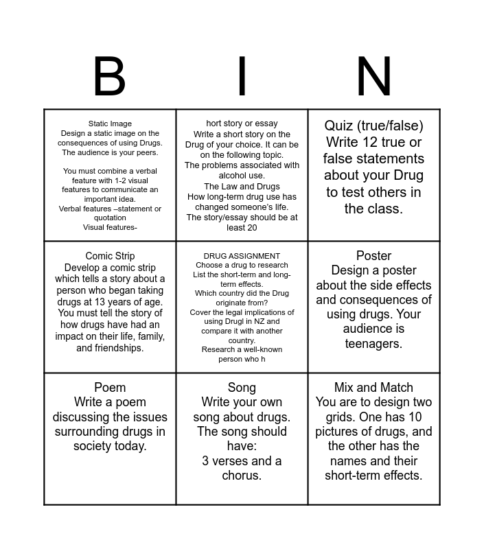 This bingo card has a free space and 8 words: Poster Design a poster about the side effects and consequences of using drugs. Your audience is teenagers., Quiz (true/false) Write 12 true or false statements about your Drug to test others in the class., hort story or essay Write a short story on the Drug of your choice. It can be on the following topic. The problems associated with alcohol use. The Law and Drugs How long-term drug use has changed someone’s life. The story/essay should be at least 20, Poem Write a poem discussing the issues surrounding drugs in society today., Static Image Design a static image on the consequences of using Drugs. The audience is your peers. You must combine a verbal feature with 1-2 visual features to communicate an important idea. Verbal features –statement or quotation Visual features-, Mix and Match You are to design two grids. One has 10 pictures of drugs, and the other has the names and their short-term effects., Comic Strip Develop a comic strip which tells a story about a person who began taking drugs at 13 years of age. You must tell the story of how drugs have had an impact on their life, family, and friendships. and Song Write your own song about drugs. The song should have: 3 verses and a chorus..